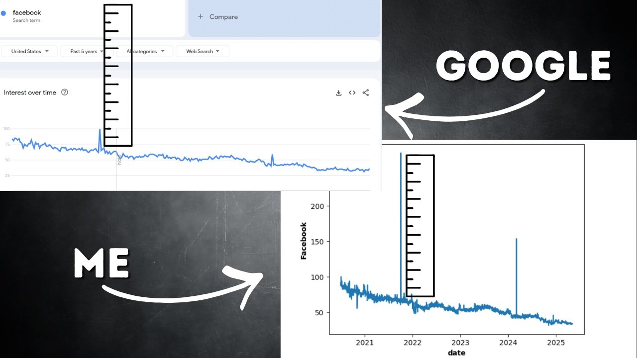 Once I put my time sequence side-by-side with Google Developments’ personal graph, my coronary heart sank. My spikes have been big as compared. I began fascinated by the best way to deal with this. Ought to I cap the utmost spike worth? That felt arbitrary and would lose details about the relative sizes of spikes. Ought to I apply an arbitrary scaling issue? Once more, it felt like a guess.