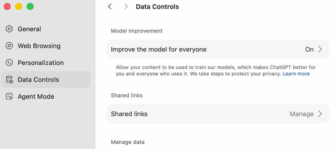 “On” means “Permit your content material for use to coach our fashions, which makes ChatGPT higher for everybody who makes use of it. We take steps to guard your privateness. Be taught extra.”