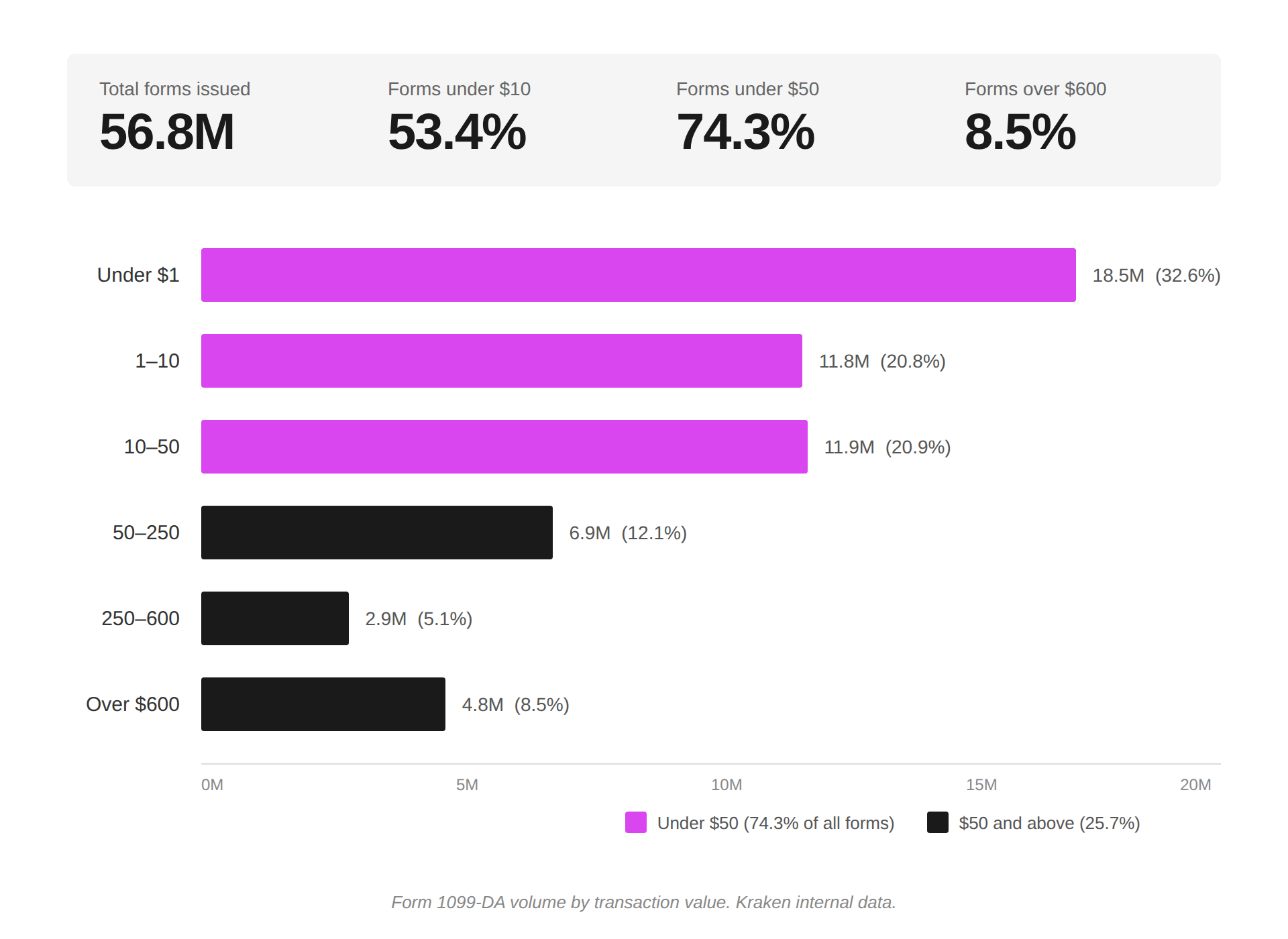 This 12 months, we issued over 56 million Type 1099-DAs (tax kind required for reporting digital asset transactions) to the IRS, one for each reportable transaction our clients made in 2025. That’s what the regulation requires though almost a 3rd of these varieties (18.5 million) have been for transactions price lower than $1. Over half have been for $10 or much less. Three out of each 4 have been for lower than $50.